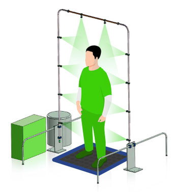 Al passaggio l’impianto entra in funzione automaticamente e la persona che passa sotto l’arco viene interessata dalla nebulizzazione dalla testa ai piedi senza essere bagnata.